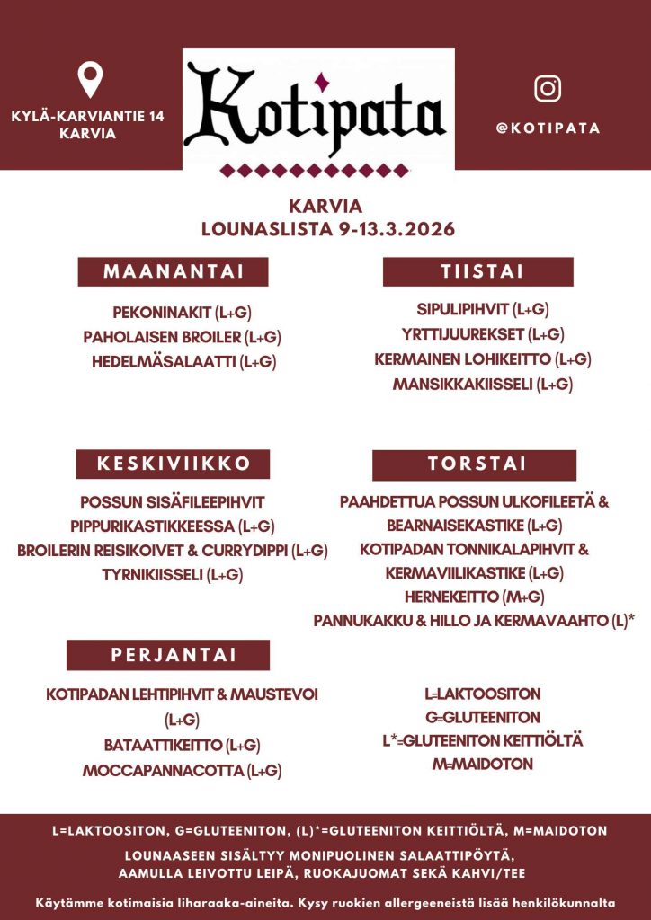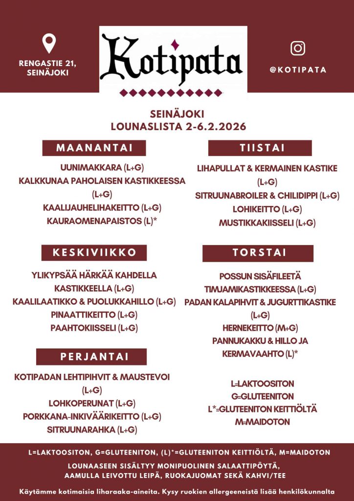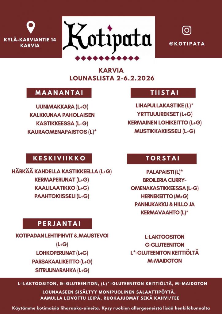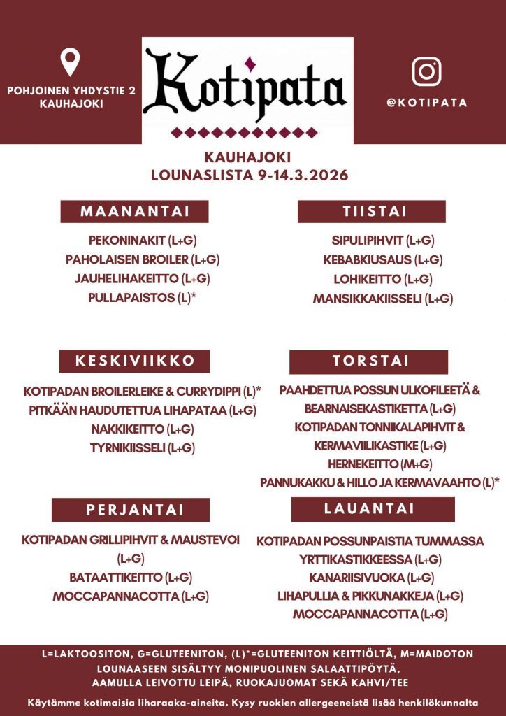 Tarjoamme herkullista ja monipuolista kotiruokalounasta. Lounaspöytä sisältää runsaan salaattipöydän, keiton, kaksi pääruokavaihtoehtoa lisukkeineen sekä jälkiruoan kahveineen.Lounas katettuna Kauhajoella ja Karviassa
